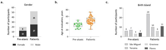 Demographic characterization of the Azorean MJD cohort (n = 72). (a) Number of pre-ataxic carriers and patients, by gender; (b) Age at evaluation/recruitment for pre-ataxic carriers and patients; (c) Number of pre-ataxic carriers and patients, by island of birth.