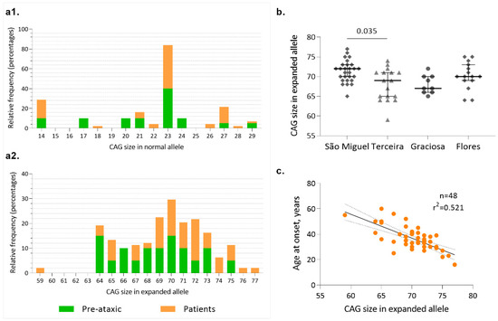 Allelic profile of the CAG repeats at ATXN3. (a1) Allelic distribution of the normal ATXN3 alleles (n = 69); (a2) Allelic distribution of expanded ATXN3 alleles (n = 69); (b) Distribution of the number of CAG repeats at the MJD locus by island of birth of carriers; (c) Linear relationship between the CAG number in the expanded allele and age at onset in MJD patients.