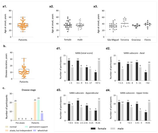 Main clinical features of the MJD Azorean cohort. (a1) Distribution of age at onset in MJD patients; (a2) Distribution of age at onset by gender; (a3) Distribution of age at onset by island of birth of the patients; (b) Disease duration in patients; (c) Frequencies of disease stages, as proposed by Klockgether and collaborators (1998); (d1) Distribution of patients by categories of the total SARA score (maximum score = 40); (d2) Distribution of patients by categories of the axial subscore of SARA (maximum subscore = 18); (d3) Distribution of patients by categories of the appendicular subscore of SARA (maximum subscore = 12); (d4) Distribution of patients by categories of the upper limbs subscore of SARA (maximum subscore = 12).