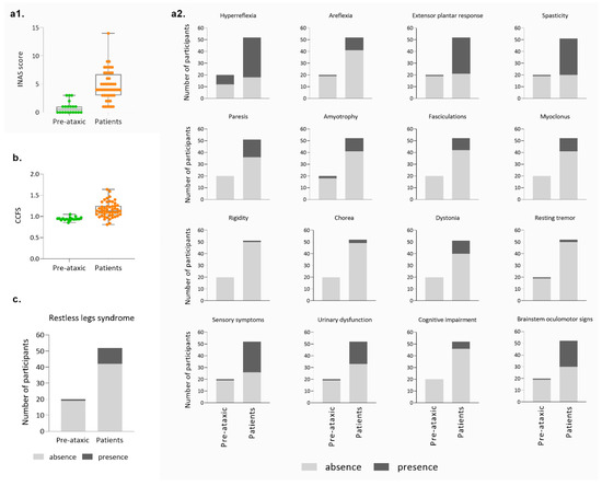 Main clinical features of the Azorean cohort (cont.). (a1) Distribution of the total INAS score of pre-ataxic carriers and patients; (a2) Presence and absence of the several signs/symptoms evaluated by the individual items of the INAS score; (b) CCFS score in pre-ataxic carriers and patients; (c) Frequency of restless leg syndrome in MJD mutation carriers.