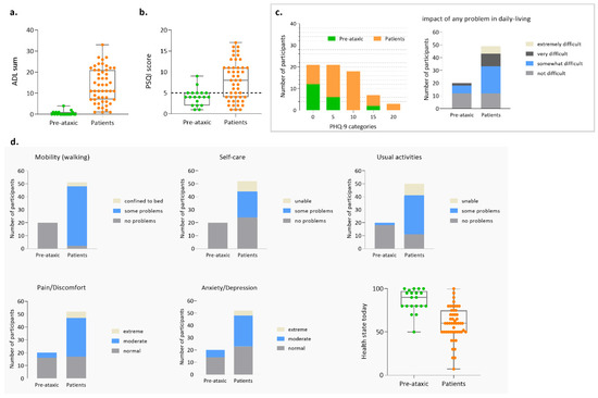 As previously reinforced, patient-based measures of subjective health status are currently considered of great relevance, both at the clinic and for research purposes, namely as endpoints of interventional trials [57]. Activities of daily living (ADL) questionnaire, whose rating produces a score from 0 to 36, indicates, as expected, that patients have functional deterioration (13.5 ± 8.19 SD) of their activities of daily living (e.g., dressing, cutting food, personal hygiene) compared to pre-ataxic carriers (0.5 ± 1 SD) (Figure 5a). Sleep quality was evaluated using the PSQI, which determines sleep quality and perturbances using seven components, producing a total score ranging from 0 to 21; poor sleep quality is indicated whenever the PSQI score is higher than five. In the Azorean MJD cohort, although only two PA carriers have a PSQI score higher than five, most patients (29/48) present poor sleep quality (Figure 5b). Depressive symptoms were evaluated by the 9-item Patient Health Questionnaire (PHQ-9), whose score ranges from 0 to 27 points; scores of 5, 10, 15, and 20 represent cutoffs for mild, moderate, moderately severe, and severe depression, respectively. In PA carriers, the majority of subjects (12/20) presented scores lower than five; noteworthy, 6/20 presented mild depression and 2/20 presented moderately severe depression. In patients, mild depression was present in 15/51 patients; moderate depression was present in 18/51 patients; moderately severe depression was present in 5/51 patients; and 4/51 patients presented with severe depression (Figure 5c). As expected, almost all patients (46/51) reported some problems walking, as indicated by the mobility item evaluation through EQ-5D-3L (Figure 5d). Of note, more than half of the patients reported moderate (30/52) or extreme (5/52) pain/discomfort. In concordance with the results based on the PHQ-9, 6/20 pre-ataxic carriers reported moderate levels of anxiety/depression, as measured by the EQ-5D-3L (Figure 5d).
