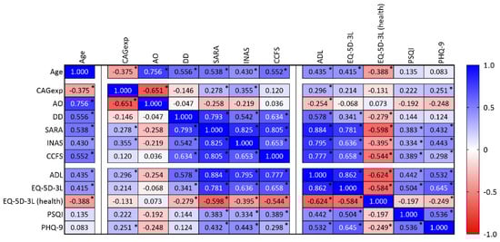Correlation matrix showing variables analyzed in the present study, namely age, the number of CAG repeats in expanded alleles (CAGexp), age at onset (AO), disease duration (DD), SARA, INAS, CCFS, ASL, EQ-5D-3L (including the health status), PSQI, and PHQ-9. Spearman correlation coefficients (cell values) were shown, and each cell was colored according to its range and direction (positive or negative). * p-value lower than 0.05.