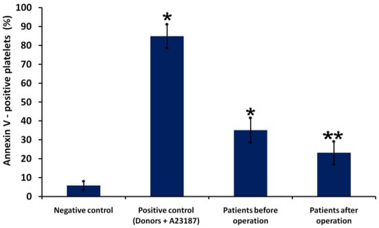 Quantitative parameters of platelet PS externalization in patients before and after surgery. Platelets from a healthy donor treated with control diluent buffer (negative control) and A23187 (positive control). Results are representative from 30 patients and 10 healthy donors. * indicates a significant difference vs. control (healthy donors) (p < 0.01); **—indicates a significant difference before and after surgery (p < 0.05, n = 30).