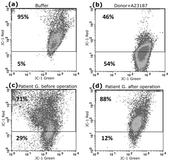Figure 4 presents cytometric dot plots of platelets showing JC-1 staining. In patient G, before surgery, we recorded membrane depolarization in 29% of platelets (Figure 4c); after the operation, the corresponding figure was 12% (Figure 4d). As a positive control, we recorded membrane depolarization changes in the platelets of a healthy donor, which were activated with a calcium ionophore (Figure 4b). We found that almost 54% of platelets were depolarized under the influence of calcium ionophore.