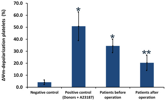 Quantitative parameters of mitochondrial membrane potential (ΔΨm) in platelets. Platelets from a healthy donor treated with control diluent buffer (negative control) and A23187 (positive control). Results are representatives from 10 healthy donors and 30 patients. * indicates a significant difference vs. healthy donors (p < 0.05); ** indicates a significant difference before and after surgery (p < 0.05, n = 30).