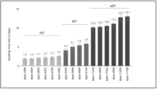 The available DPSC isolates were placed into a culture to establish and confirm previous reports of growth rates (Figure 1). More specifically, these results confirmed that six DPSC isolates (dpsc-3882, dpsc-3924, dpsc-5423, dpsc-5653, dpsc-7089, dpsc-9765) exhibited rapid doubling times or rDT between 1.9 and 2.6 days (average 2.1 days). Four DPSC isolates (dpsc-5243, dpsc-8604, dpsc-9894, dpsc-8124) exhibited intermediate doubling times or iDT between 4.2 and 5.9 days (average 5.2 days). Finally, the remaining six DPSC isolates (dpsc-4595, dpsc-9500, dpsc-11418, dpsc-11750, dpsc-11836, dpsc-17322) exhibited slow doubling times or sDT between 10.2 and 13.1 days (average 11.4 days).