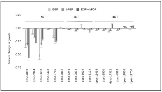 To determine any effects of these growth factors on the DPSC isolates, 96-well assays were performed with and without EGF and bFGF—both alone and in combination (Figure 2). These data demonstrated that most of the rDT (n = 4/6) DPSC isolates exhibited strong changes in growth following the administration of EGF, bFGF or both. More specifically, the addition of EGF, bFGF and the combination of EGF with bFGF significantly altered the growth of dpsc-7089 (−33.5%, −32.5%, −52.7%), dpsc-3924 (−10.7%, −16.6%, −29.9%), dpsc-5653 (−54.5%, −32.9%, −21.8%), and dpsc-9765 (−15.9%, −26.9%, = 25.3%) compared with baseline controls, p = 0.0001. Although minor changes in growth were observed with iDT and sDT DPSC isolates, none of these were statistically significant, p > 0.05.