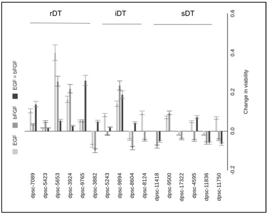 In addition, any effects on viability induced through EGF and bFGF administration were also evaluated (Figure 3). These results demonstrated that the majority of significant increases in DPSC viability were observed among the rDT isolates. More specifically, the four DPSC isolates with the most significant changes in growth also exhibited the most significant changes in viability in response to EGF, bFGF or the combination of both compared with baseline—including dpsc-7089 (10.3%, p = 0.038; 3.4%, p = 0.12 13.8%, p = 0.029), dpsc-3924 (16.2%, p = 0.026; 21.6%, p = 0.021; 2.7% p = 0.14), dpsc-5653 (40.0%, p = 0.001; 25.5%, p = 0.016; 5.5%, p = 0.08), dpsc-9765 (5.1%, p = 0079; 5.1%, p = 0.079; 25.8%, p = 0.019). Although no significant change in growth was found, another notable change in viability was observed among the iDT isolates dpsc-9894 with EGF, bFGF, and combination specific increases of 13.9%, p = 0.029; 23.2%, p = 0.018; and 18.6%, p = 0.031, respectively.