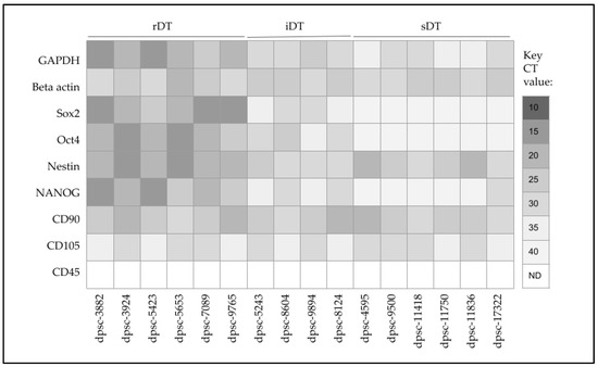Expression of the MSC biomarkers Sox2, Oct, Nestin and NANOG was observed among all the rDT (dpsc-3882, dpsc-3924, dpsc-5423, dpsc-5653, dpsc-7089, dpsc-9765) and iDT (dpsc-5243, dpsc-8604, dpsc-9894, dpsc-8124) DPSC isolates. Although Nestin was observed among all sDT DPSC isolates (dpsc-4595, dpsc-9500, dpsc-11418, dpsc-11750, dpsc-11836, dpsc-17322), NANOG was only observed in dpsc-17322. In addition, Sox2 and Oct4 were not observed in any of the sDT DPSC isolates.
