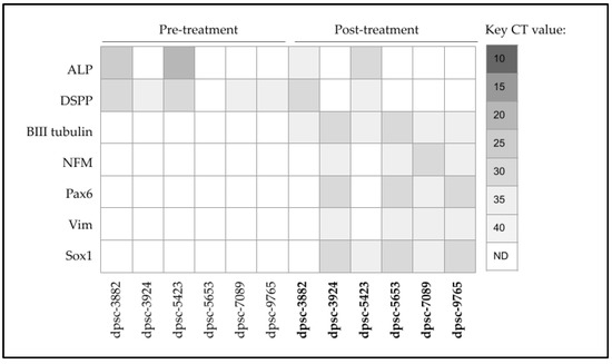 Screening of DPSC mRNA expression pre- and post-treatment. DPSC markers ALP and DSPP were expressed in both EGF-bFGF non-responsive lines dpsc-3882 and dpsc-5423. Expression of neural differentiation markers ꞵIII tubulin, NFM, Pax6, Vim, and Sox1 were observed among the EGF-bFGF responsive lines dpsc-3924, dpsc-5653, dpsc-7089 and dpsc-9765.