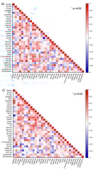 The aforementioned data on the correlation between R(dev)agNs and some symptom scores, even in HC, suggested the presence of physiological relationships among natural AAb. Based on these findings, we expanded our study to include the analysis of HC sera for correlations between the studied AAb (Figure 1c). As previously shown for a few types of AAb (especially those targeting GPCR) [10], we observed that a number of AAb targeting various organ-specific, neural, and non-organ-specific antigens correlated with each other in HC.