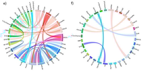 To gain better insights into the antibodiome, we presented the significant AAb correlations for each study cohort in chord diagrams. The relationship between the Aab from three antigen groups (organ-specific, neural, and non-organ-specific ones), the number of AAb correlations in patients and HC, and the loss of normal correlation signatures in the disease are more descriptive in these plots (Figure 2a–f).