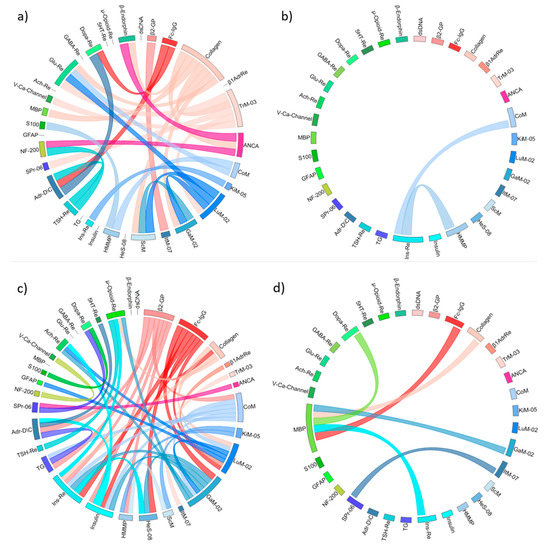 To gain better insights into the antibodiome, we presented the significant AAb correlations for each study cohort in chord diagrams. The relationship between the Aab from three antigen groups (organ-specific, neural, and non-organ-specific ones), the number of AAb correlations in patients and HC, and the loss of normal correlation signatures in the disease are more descriptive in these plots (Figure 2a–f).