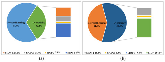 Prevalence and severity of ototoxicity according to the SIOP Boston Ototoxicity Scale. In (a) is reported the prevalence and severity of ototoxicity at the end of treatment; in (b) is reported the prevalence and severity of ototoxicity 5 years after the end of treatment.