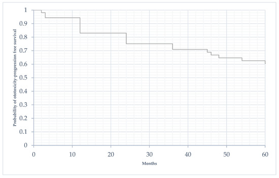 These data demonstrate that the damage from platinum compounds is perpetuated over time and can manifest itself/progress even after the conclusion of the treatment. Therefore, surveillance cannot end with the conclusion of the treatment, but must continue over time to allow for the early identification of the onset of hearing damage. Furthermore, for patients undergoing cranial radiotherapy and aminoglycoside therapy, monitoring must be even more accurate, since these patients are at risk for the progression of ototoxicity after the end of treatment. In our study, we evaluated a 5-year follow-up; however, especially in patients undergoing cranial radiotherapy and those who receive aminoglycosides, the follow-up should be continued even beyond 5 years, given the possibility of late ototoxicity and the worsening of the damage auditory system.