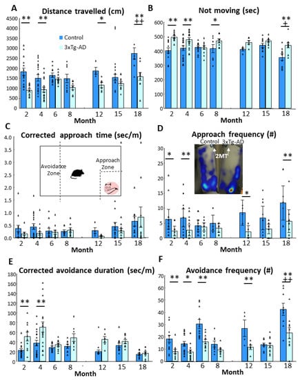 Fox odor avoidance behavior in male mice in different age groups (2, 4, 6, 8, 12, 15 and 18 months). (A) Distance travelled in centimeters during 10 min. The 3xTg-AD animals moved significantly less than the control animals (p < 0.01). Additionally, the control groups moved more with age (age: p < 0.01, genotype × age: p = 0.05). (B) Time spent without movement (“freezing”). Consistently with the previous result, the 3xTg-AD animals spent more time immobile (p < 0.01). In both groups, the tendency to freeze decayed with age (p < 0.01). (C) Corrected approach time to fox odor zone and representative image of the fox odor test. Due to differences in locomotion between the genotypes we opted to measure the approach time in s/m. In both groups, older animals spent more time near the fox odor (2-methyl-2-thiazoline, 2MT; p < 0.05). (D) Frequency of approaching the odor zone and illustrative example of mouse activity by heatmap (the warm (i.e., red) areas’ values are high and the cold (i.e., dark blue) areas’ values are low). The 3xTg-AD approached the 2MT containing zone less frequently (p < 0.01), however, this also increased with age (p < 0.05). (E) Locomotion corrected time spent in the avoidance zone. The 3xTg-AD animals spent more time in the avoidance zone than their age matched controls (p < 0.01). (F) Number of entering into the avoidance zone. As 3xTg-AD animals spent more time in the avoidance zone, they entered this zone less frequently (p < 0.01). Moreover, the age increased the number of entries in the control group, but not in the 3xTg-AD animals (p < 0.05). Data are shown as the mean ± SEM. The individual raw data points are represented as triangles. * p < 0.05, ** p < 0.01 vs. Control; + p < 0.05, ++ p < 0.01 vs. 2 m. # = amount of approach and/or avoidance frequency.