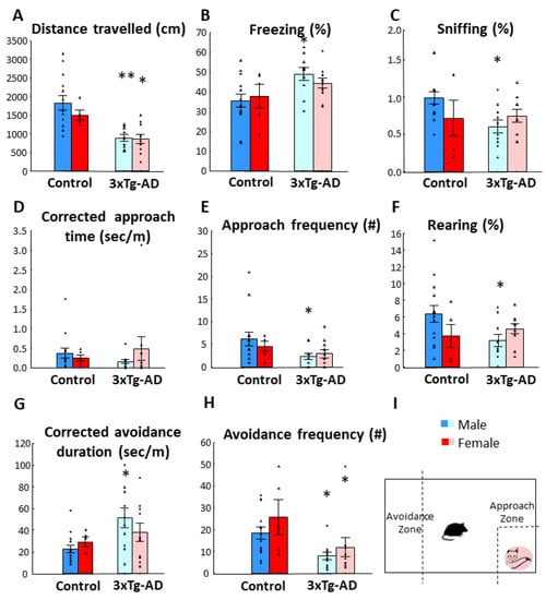 Fox odor avoidance behavior in 2-month-old male and female animals. (A) Distance traveled in centimeters during 10 min. The 3xTg-AD moved significantly less than the controls (p < 0.01) without sex difference. (B) Time spent freezing in percentage of 10 min observation period. The 3xTg-AD animals displayed increased freezing time (p < 0.01). (C) Time spent sniffing on the fox odor container. No statistical significance was observed in genotype or sex. (D) Corrected approach time to fox odor zone. No statistical significance was observed in genotype or sex. (E) Frequency in which the animals approached the odor zone. The 3xTg-AD group displayed lower frequency than the control group (p < 0.05). (F) Time spent rearing in percentage of 10 min observation period. No statistical significance was observed in genotype or sex. (G) Corrected avoidance duration. The 3xTg-AD animals spent more time in the avoidance zone than their age matched controls (p < 0.01). (H) Number of entries into the avoidance zone. As 3xTg-AD animals spent more time in the avoidance zone, they entered less often (p < 0.01). No main sex effect or genotype x sex interaction were observed in any of the presented parameters. (I) Schematic representation of the fox odor test. Data are shown as the mean ± SEM. The individual raw data points are represented as triangles. * p < 0.05, ** p < 0.01 vs. Control. # = amount of approach and/or avoidance frequency.