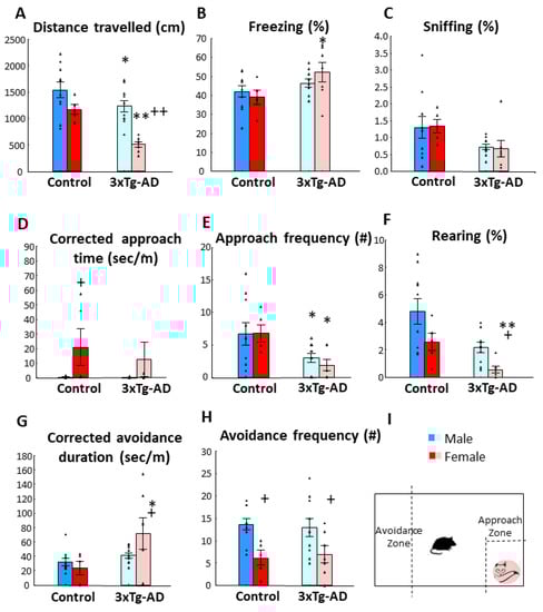 Fox odor avoidance behavior in 15-month-old male and female animals. (A) Distance traveled in centimeters during 10 min. The 3xTg-AD moved significantly less than the control group (p < 0.01). Additionally, the female moved less (p < 0.01) compared to males irrespective from their genotype. (B) Time spent freezing in percentage of 10 min observation period. The 3xTg-AD animals displayed increased freezing (p < 0.05). (C) Time spent sniffing on the fox odor container. The 3xTg-AD animals spent less time sniffing (p < 0.01) without sex difference. (D) Corrected approach time to fox odor zone. The female animals investigated the approached zone longer than males (p < 0.05). (E) Number of approaches to the odor zone. The 3xTg-AD group displayed lower frequency than the control group (p < 0.05). (F) Rearing activity. The 3xTg-AD reared less than controls (p < 0.05). (G) Corrected time spent in the avoidance zone. The 3xTg-AD animals spent more time in the avoidance zone than their age matched controls (p = 0.01). (H) Number of entries into the avoidance zone. The female animals entered into the avoidance zone less often (p = 0.01). No significant genotype x sex interaction was observed in any of the investigated parameters. (I) Schematic representation of the fox odor test. Data are shown as the mean ± SEM. The individual raw data points are represented as triangles. * p < 0.05, ** p < 0.01 vs. Control; + p < 0.05, ++ p < 0.01 vs. Male. # = amount of approach and/or avoidance frequency.