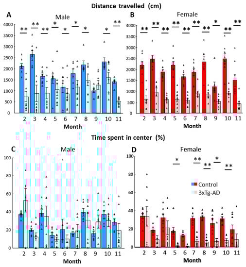 Open-field behavior during monthly testing between 2- and 11-month. (A,B) Distance traveled in centimeters during 5 min observation period. There was no overall difference between sexes, however the 3xTg-AD mice moved significantly less than age-matched controls (p < 0.01). (C,D) Percent of time spent in the center of the open field during 5 min observation. The 3xTg-AD animals spent less time in the center of the open field than the control group (p = 0.026). Data are shown as the mean ± SEM. The individual raw data points are represented as triangles. * p < 0.05, ** p < 0.01 vs. Control. The blues represent male (normal blue: control group, pale blue: intervention group), and the reds represent females ( normal red: control, pale red: intervention).