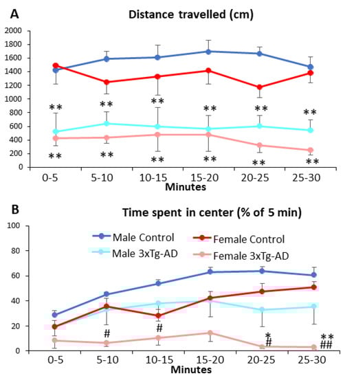 Open-field behavior during a 30 min observation period in 11-month-old animals. (A) Distance traveled in centimeters across 5 min time bins. The 3xTg-AD animals moved significantly less as their respective controls during the whole 30 min (p < 0.01). There was no difference between sexes. (B) Percent of time spent in the center in 5 min time bins. The control animals spent more and more time in the center of the arena, suggesting a reduced anxiety over time (p < 0.01), whereas the 3xTg-AD spent significantly less time in the center of the arena (p < 0.01) without habituation over time (genotype × time: p < 0.01). Data are shown as the mean ± SEM. * p < 0.05, ** p < 0.01 vs. respective control; # p < 0.05, ## p < 0.01 vs. respective male.