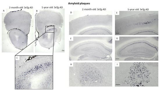 Amyloid-β1–42 plaques stained with Ni-DAB immunohistochemistry in 2-month-old and 1-year-old 3xTg-AD mice. The images show different brain areas: the olfactory bulb (A–C), motor- and somatosensory-cortex, (D,E), hippocampus (F,G), basolateral and basomedial amygdala (H,I). Scale bar in (B,E,G) is 200 μm, and in (I) 100 μm.
