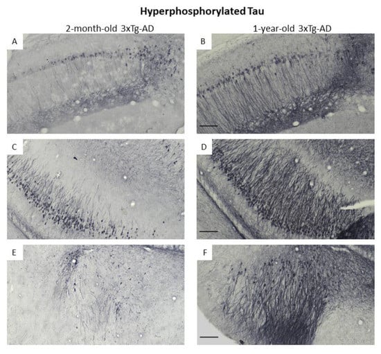 Phospho-Tau tangles stained with Ni-DAB immunohistochemistry in 2-month-old and 1-year-old 3xTg-AD mice. The images show different brain areas, like: pyramidal cell layer in the CA1 region of the hippocampus (A,B), pyramidal cell layer in the CA3 region of the hippocampus (C,D) and basolateral amygdaloid nucleus, amygdalopiriform area and entorhinal cortex (E,F). Scale bar is 100 μm.