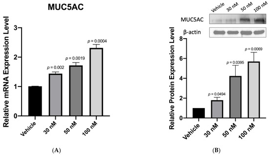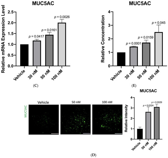 Goblet cells were seeded on 24-well culture plates with a density of 1 × 105 cells/well. After 24 h, cells were treated with 0.02% BAC (Sigma-Aldrich, St. Louis, MO, USA). After 10 min, the culture medium was replaced with fresh medium containing anti-miR-328, and cells were incubated for a further 24 h. Then, culture medium was removed, and cells were fixed in 4% paraformaldehyde blocked with 0.5% Triton X-100/5% bovine serum albumin for 2 h at room temperature. The samples were incubated with primary antibodies overnight at 4 °C and then with secondary antibodies for 1 h at room temperature. The primary antibody used in this study was mouse monoclonal antibody against MUC5AC (Clone 45M1, MA5-12178, Invitrogen, Thermo Fisher Scientific, Inc., Waltham, MA, USA). The secondary antibody used in this study was goat-anti-mouse IgG antibody (SAB4600105, Sigma-Aldrich, St. Louis, MO, USA). All images were captured using an inverted microscope (Leica DMi8, Leica, Wetzlar, Hessen, Germany).