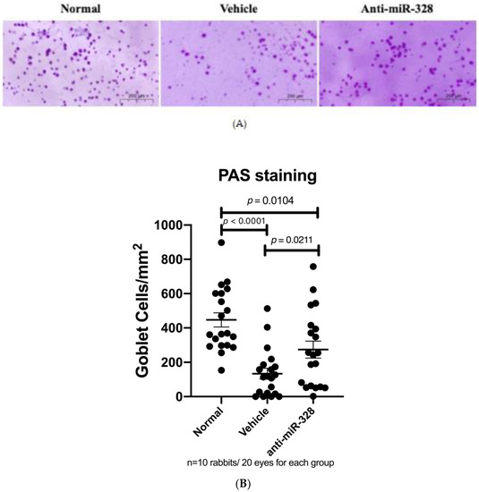 An in vivo study was conducted to confirm our findings obtained from the in vitro studies. There were 30 rabbits in the following three groups: normal control, and DED rabbits with anti-miR-328 or vehicle treatment. Impression cytology on ocular surfaces and periodic acid–Schiff (PAS) staining were performed to evaluate the numbers of mucin-positive goblet cells. Our results show that the number of goblet cells was decreased in the DED rabbits. Compared with the normal group, the anti-miR-328 group had many more goblet cells than the vehicle group (mean ± SEM: 446.7 ± 41.3, 134.1 ± 31.2, and 273.8 ± 49.0 for the normal group, vehicle group, and anti-miR-328 group, respectively). Anti-miR-328 treatment significantly increased the number of goblet cells compared to vehicle treatment (Figure 3B; p = 0.0211). The results from the animal study validated that anti-miR-328 treatment increases MUC5AC on the ocular surface.