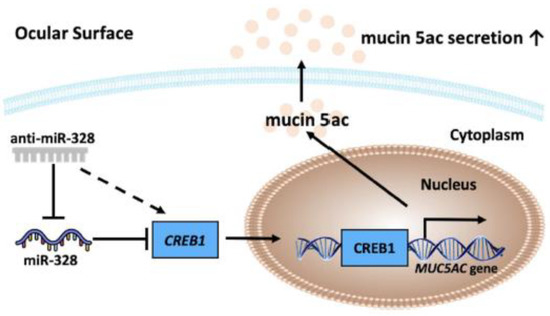 First, we conducted this study to explore how miR-328 affects mucin secretion. In this study, we demonstrated that cAMP response element-binding protein1 (CREB1) is a miR-328 target. CREB1 is a transcription factor and has been reported to bind and mediate MUC5AC gene expression [20,21,22]. We then examined the effect of anti-miR-328 on MUC5AC secretion and ocular goblet cells using in vitro and in vivo models, respectively.