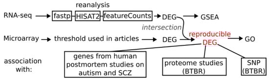 Given that estimated heritability is 50%, genetic factors are the main contributors to ASD etiology []. Nonetheless, autism has substantial phenotypic heterogeneity, which arises from multiple genetic sources and many of them overlap []. From the perspective of the complex genetic architecture of autism, Iakoucheva et al. have proposed the omnigenic model of ASDs, which posits inseparability of effects of genes which have an impact on the trait directly and gene modifiers which act indirectly through gene regulation []. On the other hand, on the basis of 28 meta-analyses, Qiu et al. recently identified 12 significant single-nucleotide polymorphisms (SNPs) in nine candidate genes [], most of which fit the definition of “core” genes. Thus, the probability of identification of at least several key genes for the ASD phenotype is still not negligible. In this context, transcriptomic and proteomic approaches provide insights into molecular characteristics to help bridge the gap between genes and functions. There are several transcriptomic articles about postmortem brain samples from ASD subjects and much fewer proteomic ones []. The number of comparative transcriptomic studies on brain samples from both ASD and SCZ patients is relatively small [,,,], and there is only a single systematic multi-omics study on ASD and SCZ [].