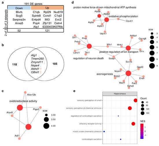 Molecular signatures in the hippocampus of BTBR mice. (a) Reproducible up- and downregulated genes in the hippocampus. Out of a total of 191 DE genes, 4 were downregulated in all 3 datasets, and 52 were downregulated in 2 out of 3; 14 were upregulated in all 3 datasets, and 121 were upregulated in 2 out of 3. (b) The overlap between the set of genes carrying a “high prediction score” mutation and the set of DEGs. Out of 124 “high prediction score” genes only 6 overlapped with reproducible DE genes set (191 gene). (c) The GO category enriched in the set of DEGs. Size of the node represents number of genes in the category. (d) The GO categories enriched in the set of differentially expressed proteins according to data from ref. []. Size of the node represents number of genes in the category. (e) Top three up- and downregulated GSEA categories in the set of all expressed genes according to reanalysis of PRJNA533538 data. NES: normalized enrichment score. Size of the circle (count) represents number of genes in the category, color of the circle represents normalized enrichment score (NES).