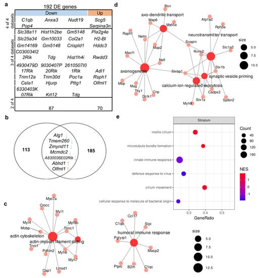 Molecular signatures in the corticostriatal area of BTBR mice. Out of a total of 192 DE genes, 4 were downregulated in all 4 datasets, and 24 were downregulated in 3 out of 4 and 87 in 2 out of 3. In all datasets, 2 genes were upregulated, 7 genes were upregulated in 3 out of 4 datasets, and 70 were upregulated in 2 out of 4. (a) The comparison of DEGs from the corticostriatal area. (b) The overlap between the set of genes carrying a high-prediction-score mutation and the set of DEGs. Out of 120 “high prediction score” genes, only 7 overlapped with reproducible DE genes set (192 gene). (c) The GO category enriched in the set of DEGs. Size of the node represents number of genes in the category. (d) GO categories enriched in the set of differentially expressed proteins on the basis of data from Ref. []. Size of the node represents number of genes in the category. (e) Top three up- and downregulated GSEA categories in the set of all expressed genes according to the reanalysis of GSE138539 data. NES: normalized enrichment score. Size of the circle (count) represents number of genes in the category, color of the circle represents normalized enrichment score (NES).