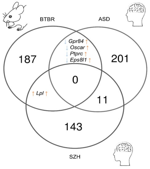 One of the most widely used animal models of idiopathic ASDs is the BTBR T+ Itpr3tf/J (BTBR) inbred mouse strain. The phenotype of BTBR mice is relevant to major diagnostic symptoms of ASDs, including reduced social interactions and stereotyped behavior [,,]. BTBR mice share neuroanatomical features with a subgroup of ASD patients and have a complex molecular phenotype [], but the underlying genetic abnormalities are unclear and still being investigated. To date, only one study has matched the transcriptome of BTBR mice with transcriptomic data from ASD patients []. So far, only some features of SCZ have been modeled in the BTBR strain. Social withdrawal as a consequence of disrupted sociability is the main early symptom of both ASDs and SCZ. In this context, BTBR mice have been employed for research into the social dysfunction relevant to SCZ []. Reduced GABA and increased glutamate concentrations in the prefrontal cortex (PFC)—as well as weakened maturation of GABA circuits accompanied by impairments of multisensory integration—reflect the features of an SCZ-like phenotype in BTBR mice [,]. Moreover, one of the major genetic risk factors of SCZ, a spontaneous deletion of the Disc1 gene, is also present in BTBR mice []. Because BTBR mice are often used to explore various therapeutic strategies aimed at alleviating autistic-like symptoms, it is important to understand the degree of genetic convergence between this animal model and both ASD and SCZ patients.