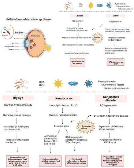 The pathogenesis of numerous conditions associated with the ocular surface, such as glaucoma, uveitis, dry eye, and cataract formation, has been directly linked to enhanced ROS production and reduced antioxidant defense [3].