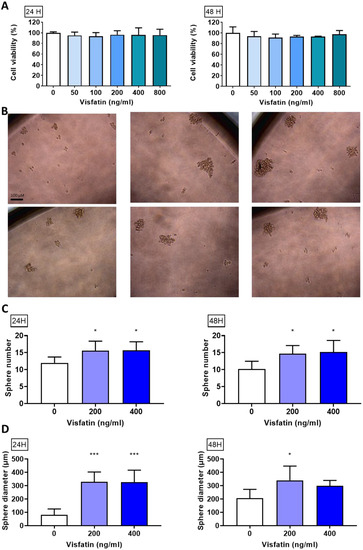 To evaluate whether visfatin could activate stemness ability and self-renewal in breast cancer, MDA-MB-231 cells were treated with visfatin (0, 200, or 400 ng/mL) for 24 or 48 h (Figure 1B) while using a sphere-forming assay and calculate the sphere number (Figure 1C) and diameter (Figure 1D). Our results showed that visfatin significantly increased the sphere formation ability.
