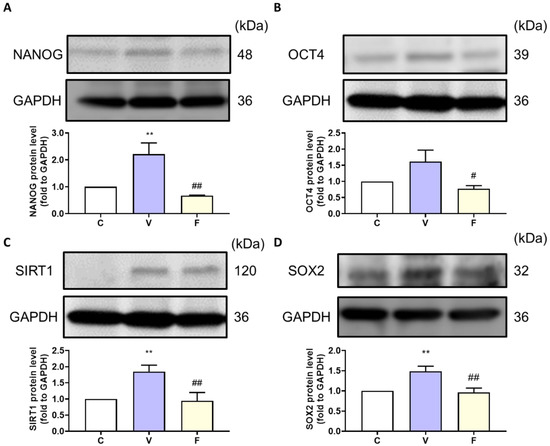 Effect of visfatin on stemness-related protein expression in xenograft tumor tissue. The tumor stemness-related expression of (A) NANOG, (B) OCT4, (C) SIRT1, and (D) SOX2 proteins. Data are presented as mean ± SEM. C, control group. V, visfatin-induced group. F, visfatin + FK866 inhibitor group. ** p < 0.01 compared to C. # p < 0.05 and ## p < 0.01 compared to V.