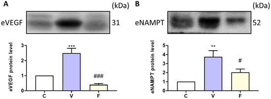 Effect of visfatin on serum angiogenesis marker and extracellular NAMPT expression. The protein expressions of (A) VEGF and (B) eNAMPT were analyzed by Western blot. Data are presented as mean ± SEM. C, control group. V, visfatin-induced group. F, visfatin + FK866 inhibitor group. ** p < 0.01 and *** p < 0.001 compared to C. # p < 0.05 and ### p < 0.001 compared to V.