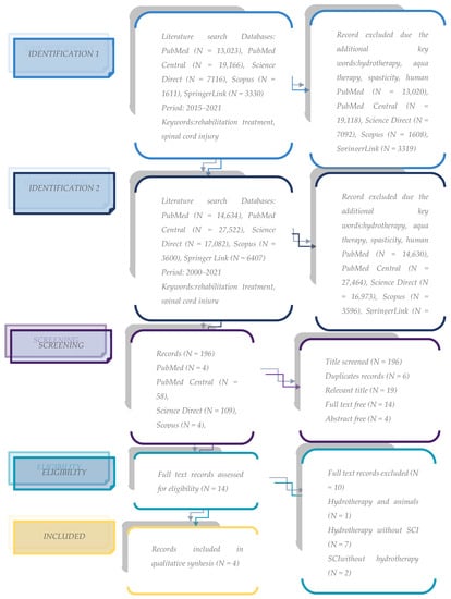 The study initially started with a search in the databases mentioned above for a shorter period, namely 2015–2021. Given the small number of articles eligible for a review to demonstrate the importance of hydrotherapy in the therapeutic management of patients with spinal cord injury, the search period was extended to 2000–2021, keeping the same databases. Unfortunately, the number of items identified as eligible did not increase significantly.