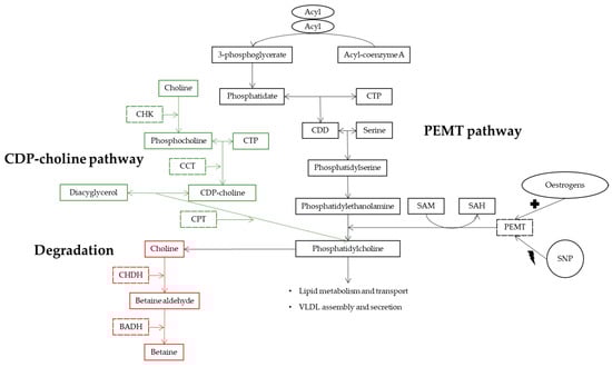 The MTHFR gene is involved in PC synthesis obtained either from choline-derived or 1-carbon pool-derived methyl-groups []. The CHDH, BHMT and PEMT also seem to be important factors for the pathway forming PC []. On the other hand, the gene product of SLC44A1 is required in choline transport into the hepatocyte and then into the mitochondria [].