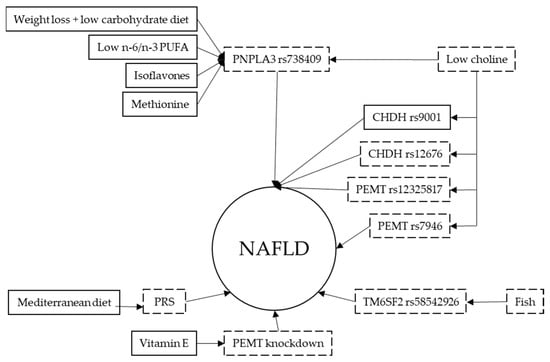 Specifically, we will elaborate on four specific polymorphisms: PNPLA3, TM6SF2, PEMT, and CHDH, and highlight the dietary patterns/nutritional factors that are associated with their SNPs. Although other genes, such as apolipoprotein C3 (APOC3), and gene choline kinase alpha (CHKA) also seem to play a role in the genesis and development of NAFLD, their connections with nutrition and dietary patterns are still missing [,].