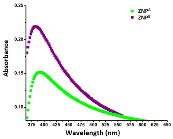 UV-visible spectroscopy is an effective method for investigating the opto-structural features of ZNPs at room temperature. The samples were scanned at a wavelength range of 350–650 nm, and the absorption peak (λmax) was recorded. Metallic nanomaterials display a wide surface plasmon resonance (SPR) absorbance maximum in the ultraviolet (UV) region of the spectrum [65,66]. The ZNPs exhibit narrow absorption bands around 379 and 388 nm (UV-A region), respectively, without any additional peaks, indicating coupled light waves as well as the electron vibrations of nanoparticles [67,68]. This absorbance peak corresponds to the optical band gap of ZnO [9]. The detected peak values depict wurtzite structural characteristics [69].