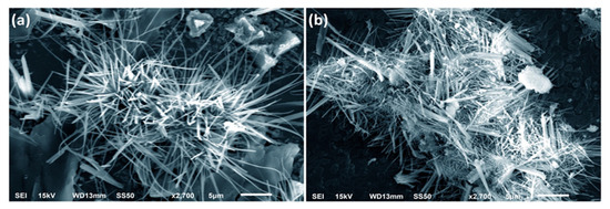 SEM image of ZNP specimens prepared by extending the incubation period: (a) 2 weeks, ZNPA; (b) 10 weeks, ZNPB.