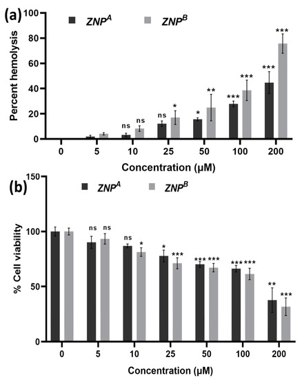 ZNPA exhibited 15.68 ± 1.153 and 27.85 ± 2.30% RBC cell lysis at concentrations 50 and 100 μM, respectively. Similarly, ZNPB displayed 24.95 ± 10.46 and 38.62 ± 8.07% hemolysis at the same concentrations tested. At a much higher concentration of 200 µM, significant hemolytic activity (44–75%) was observed (Figure 5a). Moreover, the data showed that ZNPB has higher hemolytic activity compared to ZNPA due to its large size. One study came to the same conclusion and discovered comparable results [115].