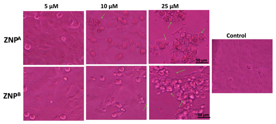 The morphology of the control appeared even, smooth, and flattened, maintaining their pristine condition when treated with ZNPs (Figure 6). Contrastingly, the treated A431 cells demonstrated characteristic apoptotic changes showing shrunken, spherical, and nonadherent cells with chromatin condensation. The influence of ZNPs on cancerous cells’ anatomy was shown to be dose- as well as size-dependent. Moreover, ZNPA treatment was more effective, revealing a large collection of rounded, shriveled cell arrangement. Similar studies have demonstrated that after ZNP treatment, cells drastically change their morphology and clump together in the medium [122]. This is in agreement with earlier findings indicating finer nanomaterials exhibit higher cytotoxic action [123,124].