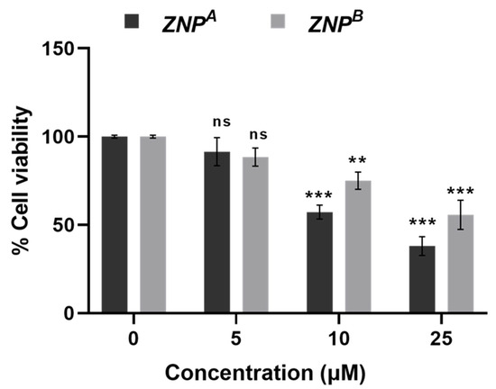 Cell growth inhibitory action of various ZNP samples at different concentrations displayed a dose-dependent effect (Figure 7). Only 91.46 ± 2.13, 57.23 ± 0.34, and 38.00 ± 1.27% (p < 0.0001) cells remained viable when treated with ZNPA at a concentration of 5, 10, and 25 μM. However, ZNPB was more cytotoxic to A431 cells, reducing cell viability to roughly 88.45 ± 1.13, 75.05 ± 0.92, and 55.68 ± 2.20% (p < 0.0001) at the same concentration range. Patel et al. [125] reported 52.71% viability of A431 cells at 25 µM concentration after 48 h exposure. The IC50 value of ZNPA and ZNPB was found to be ~9 μM and >25 μM, respectively. The literature survey reveals comparable IC50 estimates for ZNPs [36,126,127]. The reduction in cancer cell survival as per MTT data verifies ZNP-induced apoptosis in A431 cells [128].