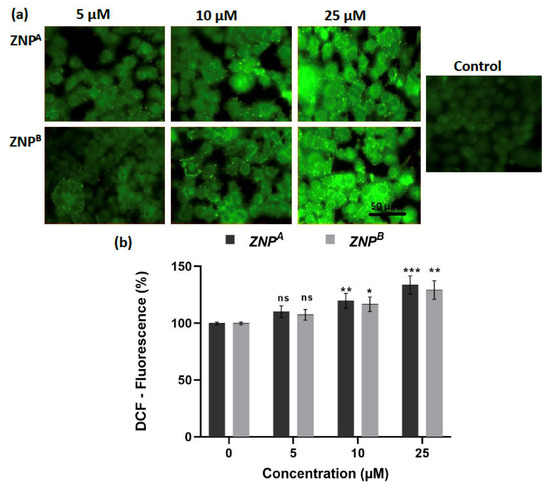 Following 24 h of incubation, ZNPs significantly boosted ROS formation in A431 cells, as evidenced by high cytosolic green fluorescence intensity (Figure 8a). The ROS generation by ZNPs depended on the amount of therapeutic dose, as previously reported [129,130]. Quantitative analysis of ROS revealed that 5 μM of ZNPA increased ROS generation by 110.27% (non-significant), while ZNPB at the same concentration enhanced ROS level by 107.54% (non-significant) (Figure 8b). Furthermore, ROS levels were elevated by 119.81% (p < 0.001) and 116.86% (p < 0.0001) compared to the control at 10 and 25 μM concentrations of ZNPB, respectively. Likewise, similar concentrations of ZNPA led to the increase in ROS production by 133.81% (p < 0.001) and 129.36% (p < 0.01), respectively, over the control (Figure 8b).