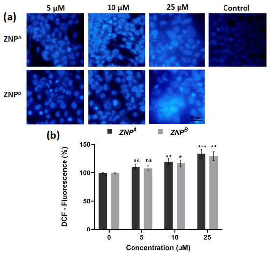 We further investigated chromatin condensation as an apoptotic feature using 4′, 6-diamidino-2-phenylindole (DAPI) labeling. A431 cells were incubated with ZNPs for 24 h prior to evaluation for DNA integrity. Compared to untreated cells, DAPI staining revealed significant chromatin condensation in treated cells compared to untreated control (Figure 9). Maximum chromatin condensation was observed at 25 μM concentration of ZNPs (Figure 9a,b). The shrunken nuclei in A431 cells are indicative of apoptotic cell death. ZNPA and ZNPB at 5 μM concentration induced generation of 11.14% (non-significant) and 10.38% (non-significant) apoptotic cells, respectively. At a concentration of 10 and 25 μM, 23.86% (p < 0.001) and 34.45% (p < 0.0001) apoptotic cells were observed for ZNPA, while approximately 18.49% (p < 0.01) and 29.25% (p < 0.001) of apoptotic cells were observed for ZNPB at the same concentration (Figure 9b). These results allow the conclusion that the compounds promote apoptosis in A431 lung cancer cells.