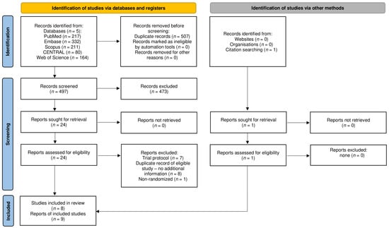 Altogether, 1004 records were identified by the systematic search, and 1 additional record was found during the overview of the references and citations of eligible studies and the meta-analyses of the same topic [42]. After the selection process shown in Figure 1, eight eligible studies were identified, reported on by six full texts [17,30,31,43,44,45] and three conference abstracts [42,46,47]. Abstracts by Vasudevan and Reddy are considered multiple reports of the same RCT.