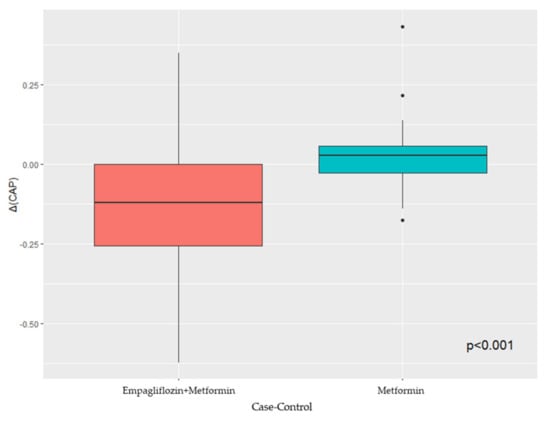 Sixty-three metformin-treated T2DM patients with an echographic diagnosis of NAFLD (aged 60.95 ± 11.14 years; males, 57.1%) were included in the present analysis. Among them, 33 patients continued metformin monotherapy (control group), whilst 30 patients (47.6%) received a combination of metformin + empagliflozin (experimental group). The case group showed a higher level of glycated hemoglobin and AST, and fewer patients were treated with angiotensin-converting enzyme inhibitors (ACEi) and diuretics. All baseline characteristics are reported in Table 1 and Table 2. At the 6-month follow-up, the experimental group presented a significant reduction in BMI, glycated hemoglobin, ALT, CAP parameter, and steatosis degree in comparison with the control group (Table 2). The box plot analysis showed that the median ΔCAP was significantly lower in patients in the experimental group compared with those in the control group (Figure 1).