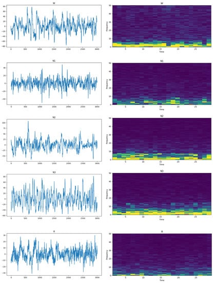 EEG epochs in the time and frequency domain. From top to bottom are stages W, N1, N2, N3 and REM. EEG epochs in the time domain are displayed on the left and the short-time Fourier transform (STFT) of EEG epochs is shown on the right. The yellow color represents higher amplitudes and the blue color indicates lower amplitudes.